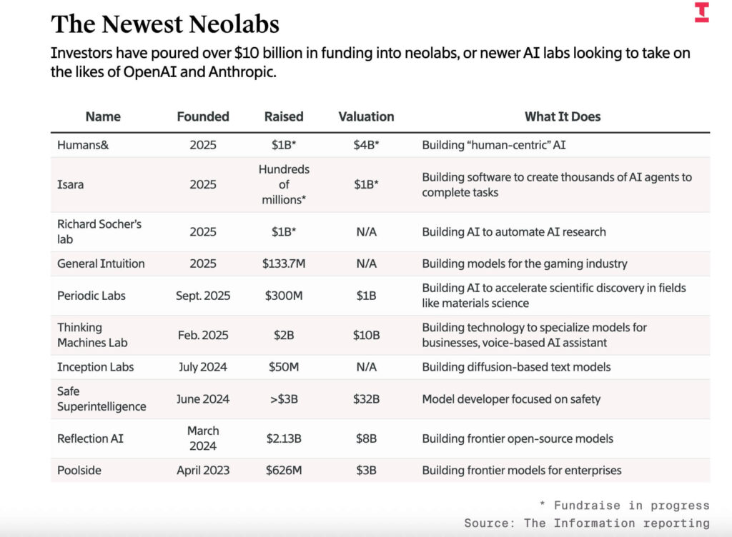 The foundation-model landscape and overwhelming majority of model-training spend has consolidated around five incumbents: OpenAI, Anthropic, Google, Meta, and xAI. This is mainly driven by capex intensity, data gravity, and distribution advantages. In parallel, a second wave of “neolabs”, or newer AI labs has emerged, raising $10B+ in the past two years. Notable examples include: Humans& ($1B raised at $4B valuation), Mira Murati’s Thinking Machine Labs (actively raising at ~$50B valuation), Richard Socher’s Lab ($1B), and Inception (>$50M seed raised at ~$260M valuation).